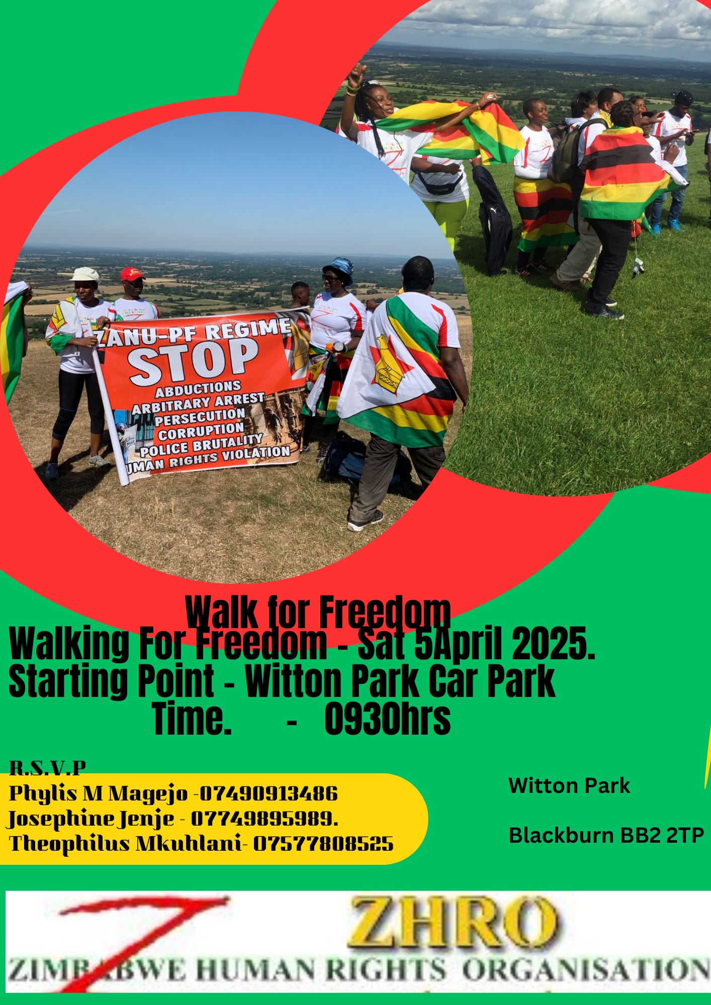Today, 30 March, 2025 at 14:00 hrs four (4) Zimbabwe Human Rights (ZHRO) members including John Burke held a telephonic conversation in preparation for a Walk for Freedom at Wilton Park in Blackburn. The other three present were Phylis Melody Magijo, Theophilas Mkuhlani and myself, Josephine.