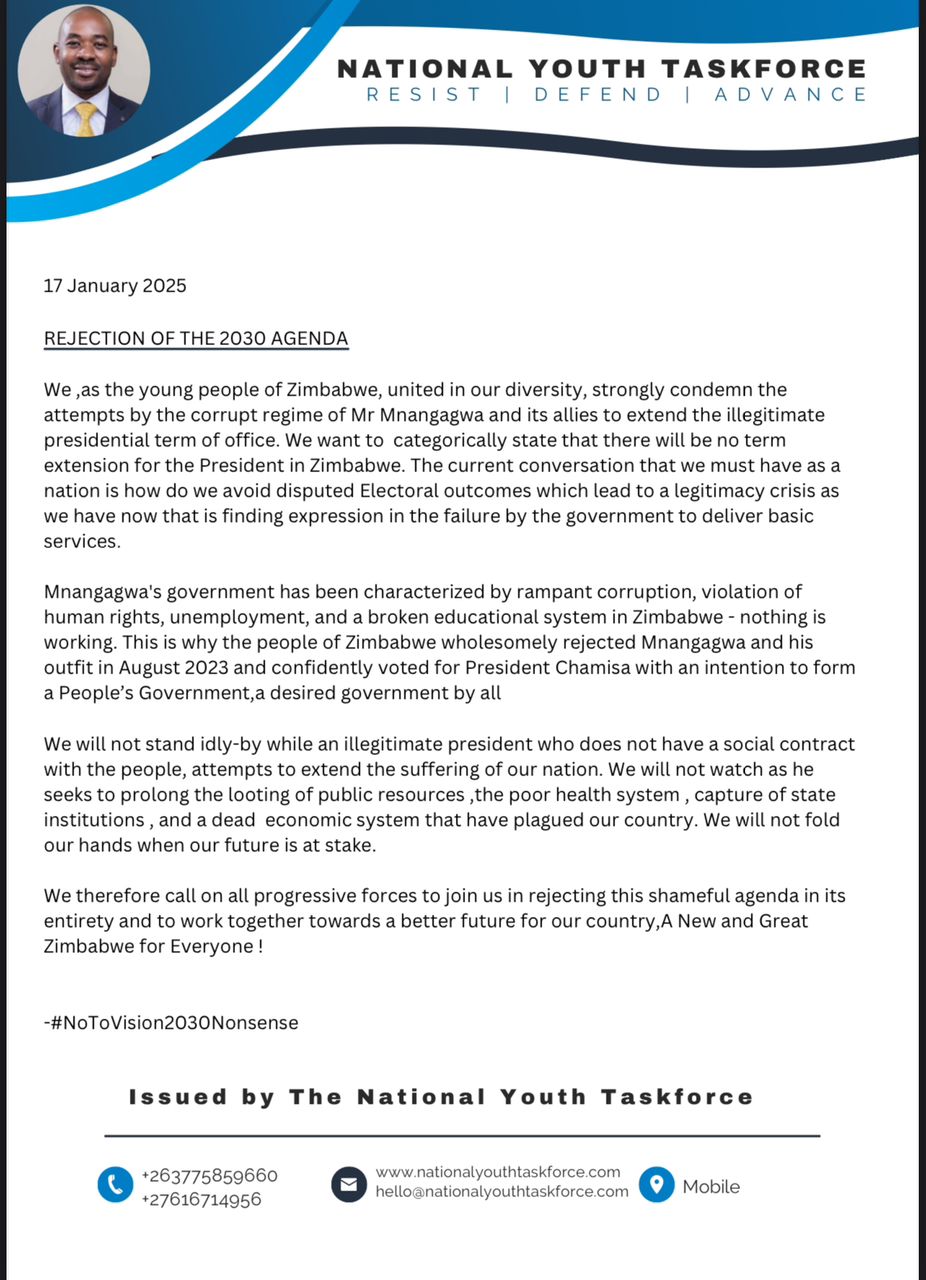 We, as the young people of Zimbabwe, united in our diversity, strongly condemn the attempts by the corrupt regime of Mr Mnangagwa and its allies to extend the illegitimate presidential term of office. We want to categorically state that there will be no term extension for the President in Zimbabwe. The current conversation that we must have as a nation is how do we avoid disputed Electoral outcomes which lead to a legitimacy crisis as we have now that is finding expression in the failure by the government to deliver basic services.